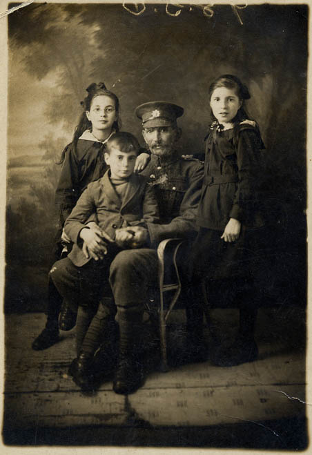 Albert Wilkins in full army uniform with children, left most Vera Wilkins wearing glasses, Leslie Wilkins on knee and Freda Wilkins on right. | c.1918 |