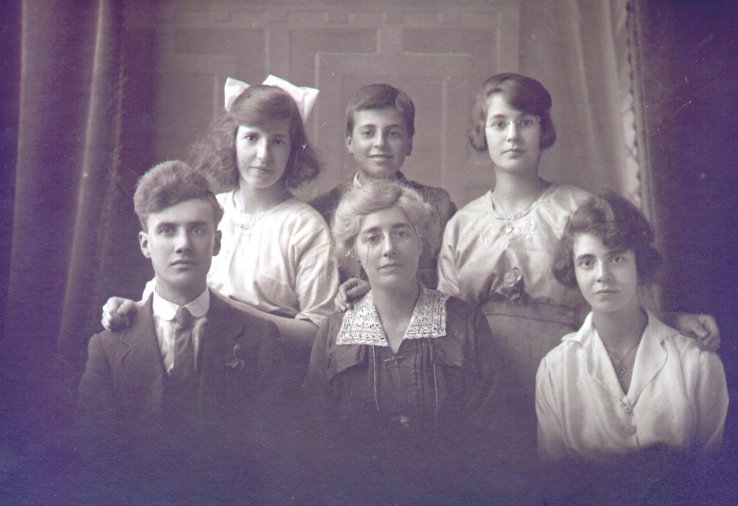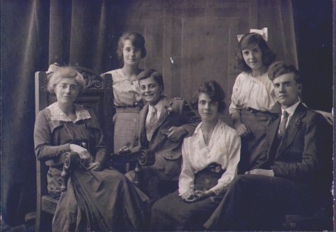 | 00027 | Florence Wilkins (nee Weston) with her family. Freda Wilkins (back left), Leslie Wilkins (back middle), Vera Wilkins (back right), Albert Wilkins (front left), Florence Wilkins (front middle), Winifred Wilkins (front right). Photographer H. M. Veale. | c. 1918 |