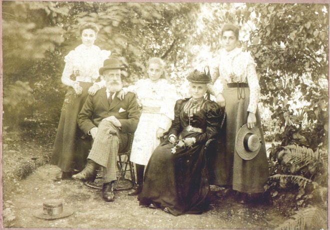 | 00028 | William Weston with his wife Mary Ann Weston (nee Brett) with their daughters Florence (far left), Mabel (middle) and Maud (far right). | c. 1900 |