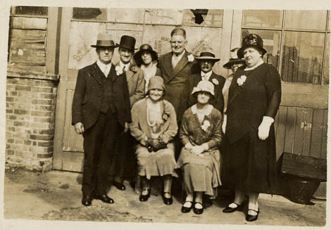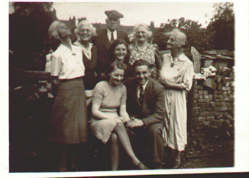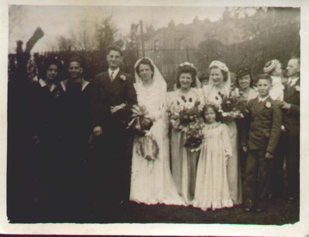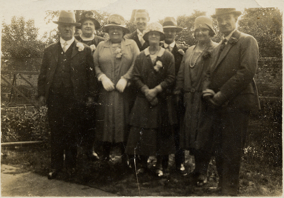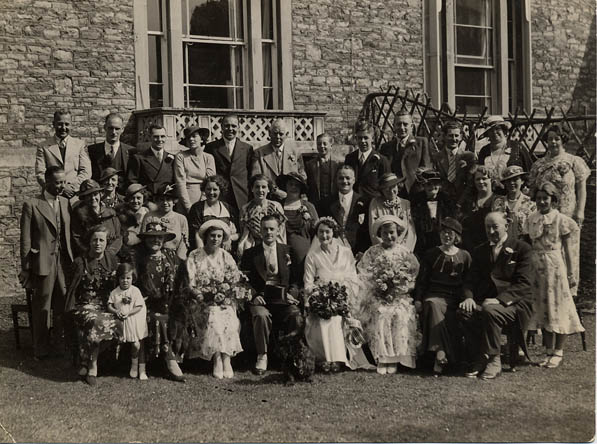 Wedding photograph of Kathleen Elizabeth Brookbank and Leslie Haddacks wedding. Far left Florence Millett, Norah Millett, John A. Brookbank, Kathleen Betty Brookbank, ?, Leslie Haddacks, Elsie Poole, ?, ?, ?, Violet Millett, ?, Mary Brookbank. ?, Keith Brookbank, Kathleen Millett. | c. 1940 |
