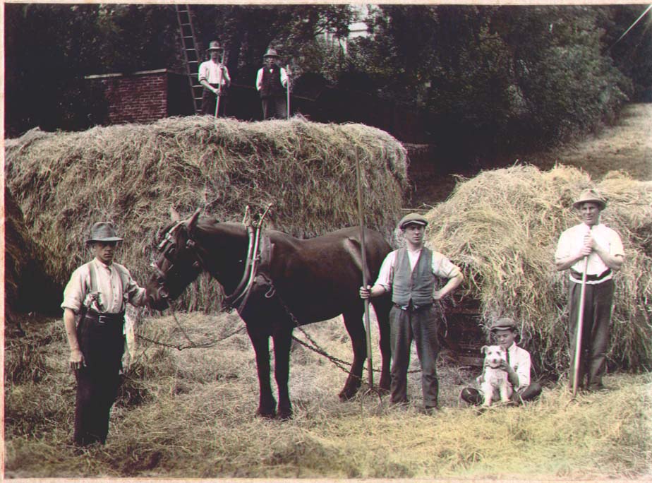 | 00052 00052 | Left to right. Tom Pettiford, Percy Pettiford, ?, Duke the dog, James Frederick Taylor 2nd. Back James Frederick Taylor 1st, ?. Haymaking in their field at rear of Cavendish place and opposite Upper Common in Bath. | 1924 |