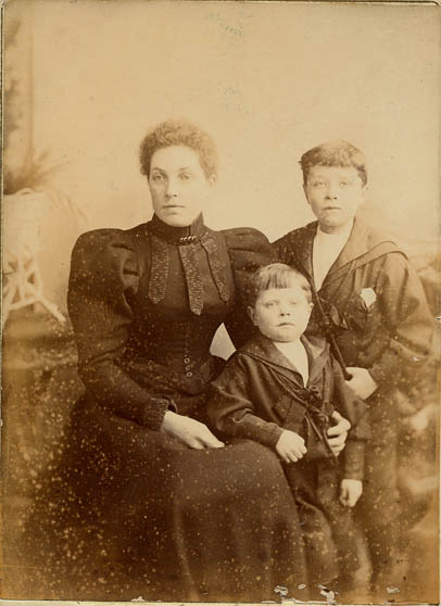 Possibly Julia Bowden (nee Mitchell), with boys Arthur and William . Photographer C. Burchill, 8 Dolphin Street, Bristol. (Dated from photographers plate.) | c. 1894 |